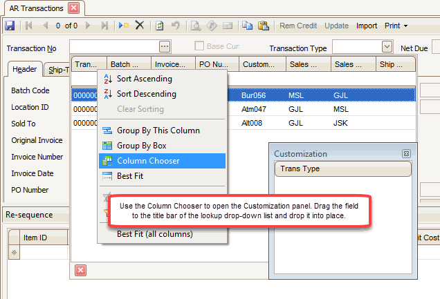 - If you want to edit an invoice or credit memo, select one from the Transaction No. drop-down list, then click the Update button on the toolbar. To add Transaction Type to the drop-down list, right-click on the title bar of the lookup drop-down list and select the Column Chooser. Drag the Transaction Type field to the title bar and drop it in place.
