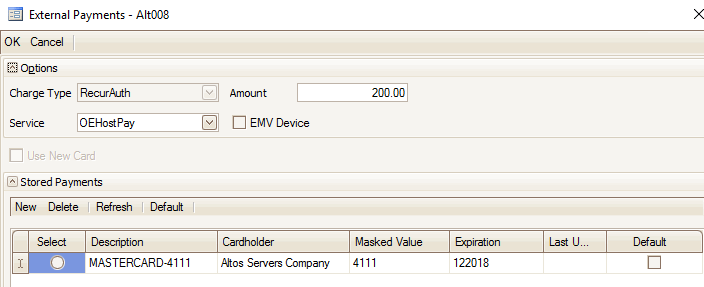 ) to view the emails to and/or from the vendor selected, searching for the email address on the General tab. You must complete the Message Tracking Setup in System Manager to use this function. - Use the Payment button, if available, to enter credit card information to apply to the recurring entry. If the customer's Payment Method ID is set to an external payment processor, an external payments entry form will appear.