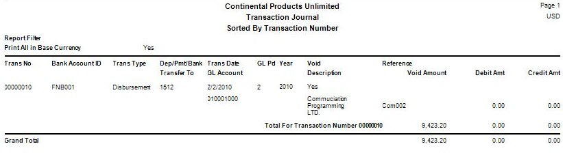 Use the Transaction Journal to check for errors and omissions and to use as an audit trail of Bank Reconciliation transactions. Only unposted transactions entered in the Bank Reconciliation Transactions appear in the journal.