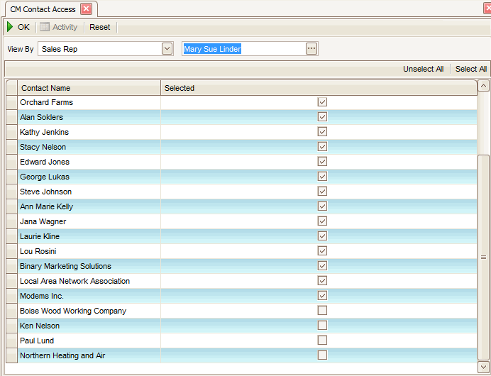 Note: Unselecting a check box will deny the sales rep access to the contact. - Click OK to process the contact access.