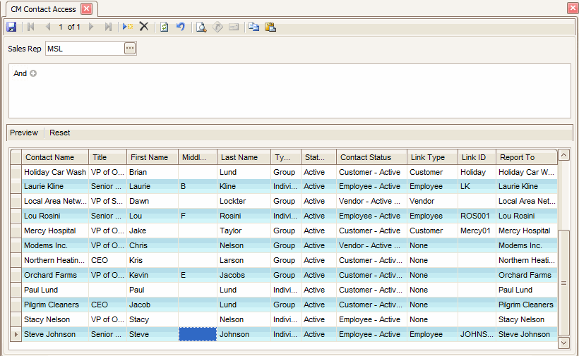 You must first use the SM Administration User Mapping function to assign user id’s to sales reps or customers to have the contact access work properly. See User Mapping for details on setting this up.