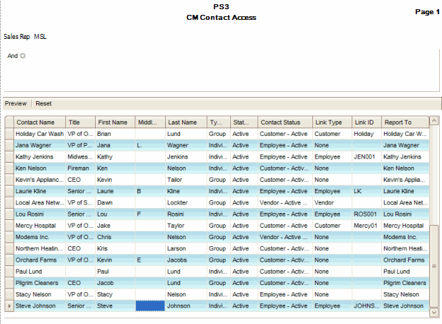 - Use the filter area to filter the contacts that will be displayed and click Preview to display the contacts that meet the filtering criteria. Click Reset to clear the filtering and start over.