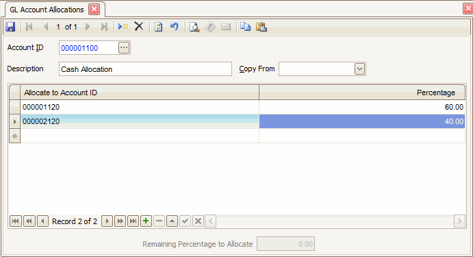 Note: The percentage left to allocate appears at the bottom of the screen. If you allocate to two accounts or more, make sure to change the percentage allocated for the first entry. The percentage remaining to allocate must equal 0 when you finish adding accounts. - Click the Save button, on the toolbar, to save your changes.