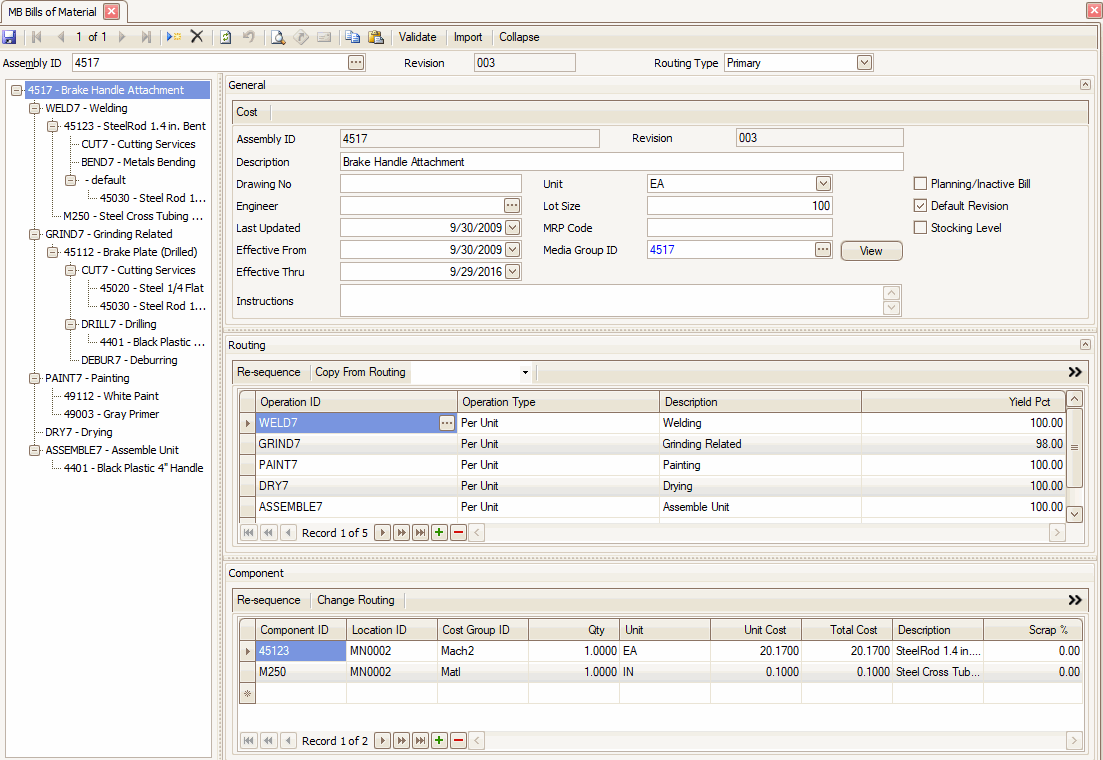 The Bills of Material function within Setup and Maintenance is the most important function in the Bills of Material application. Most other functions in the Bills of Material application are designed around this process, making the maintenance of the bill easier, more accurate, efficient, and flexible. The BOM consists of both material components and routings, and then makes a connection between the two.