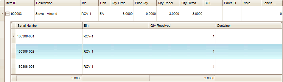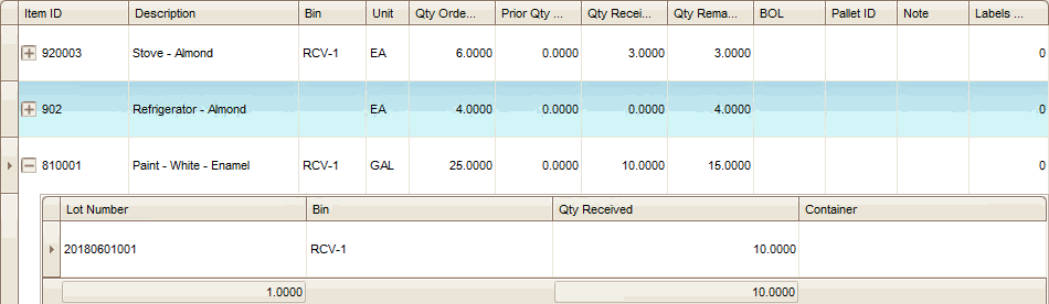 Like the Record Picked Orders function, this function does not update item quantities in Inventory and transactions in Purchase Order or Warehouse Management until you confirm the entries you have made. When you click the Confirm button on the Receive Goods screen, Warehouse Management updates item quantities and transaction status, as needed.
