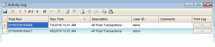 The Activity Log dialog box appears when you click Activity. The Activity Log dialog box tracks all post activity for administrative purposes. The system assigns each post a run ID.
