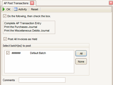 Note: This option only appears if you elected to use batch processing in the Business Rules function. You can use the All button to select all batches to post or you can use the None button to deselect all batches from posting. - Enter comments for the post, if applicable, in the Comments field.