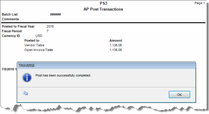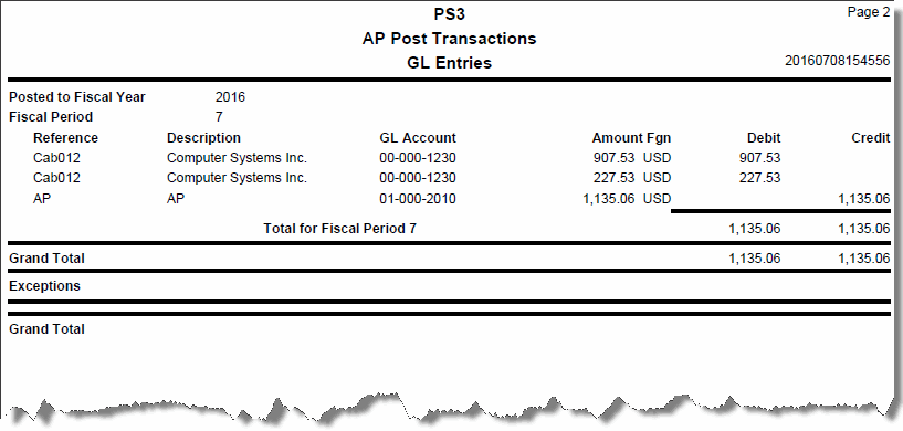 If Accounts Payable interfaces with General Ledger, debit and credit entries are created in the GL Journal. If you post detail information, entries are made for each line item. If you post summary information, one entry is made for each account. If the accounting period is closed, you can either edit the transactions or use the System Manager Period Conversion function to open the accounting period and then post the transactions.