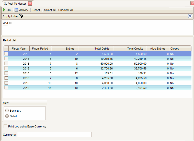 - Select the period(s) from which to post transactions using the Select All button, Unselect All button, or the check box adjacent to the period(s).