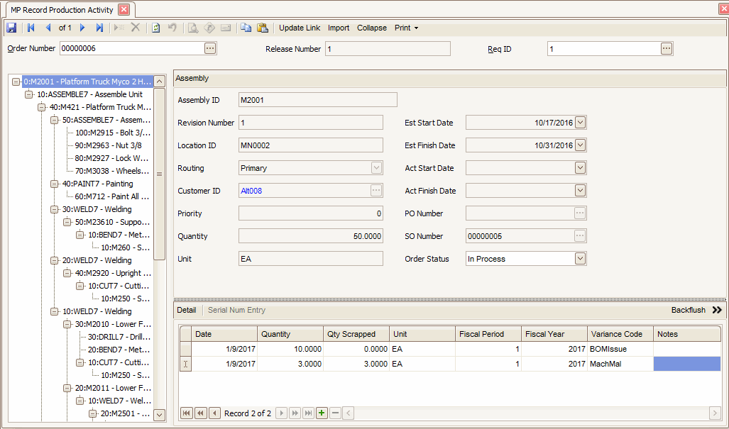Note: If you select Completed, you can not make any additional changes to the component's production activity. - Click the Save button, on the toolbar, to save the recorded production activity.