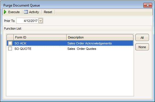 The Function List displays the Form ID(s) (document types) of any sent documents in the queue. To purge all sent documents of a particular type, mark the check box for the form ID. Use the All button to mark all check boxes. Use the None button to clear all check boxes.