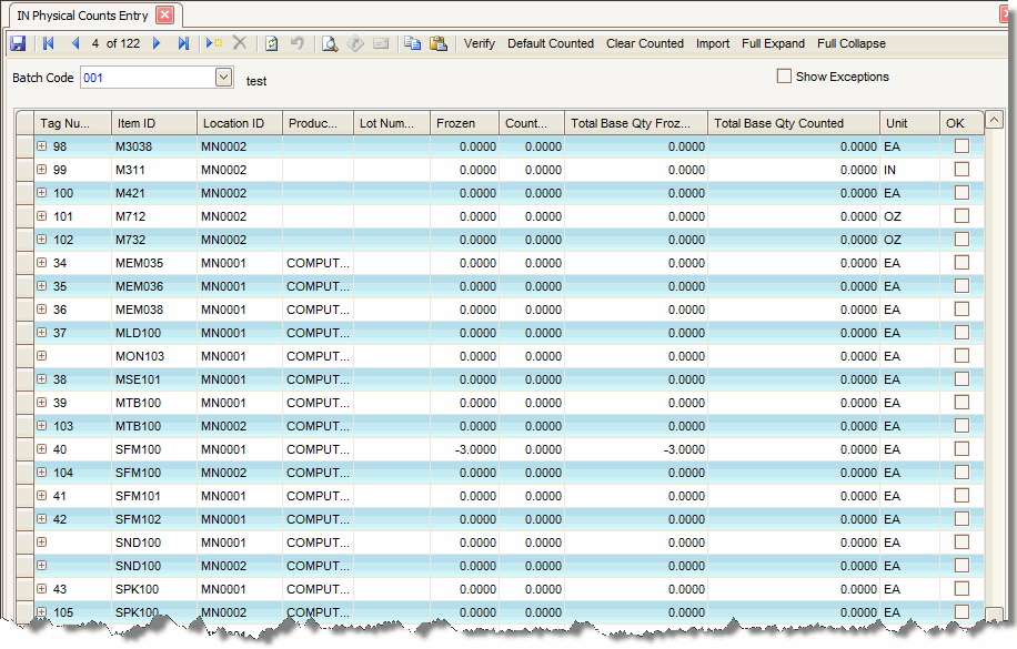 Use the Physical Count Entry function to enter the counts if you use tags or worksheets to record physical counts. The current batch is locked while you enter physical counts to prevent other users from editing the batch and from selecting the batch to update perpetual inventory.