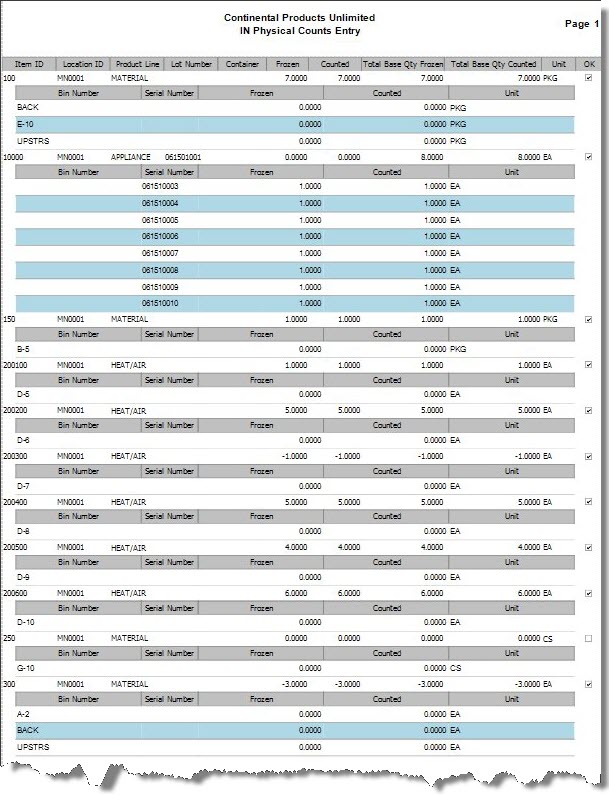 Note: If you freeze a batch that contains a serialized item with multiple bins, physical count records are created for each bin, but only one record can have a counted quantity of one. A message appears if you try to enter a count and a counted quantity of one already exists for the serialized item.