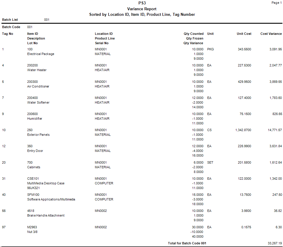 Use the Variance Report after you have entered and verified physical counts to compare the original frozen quantities to the counted quantities. Variances are expressed as quantities and are based upon your inventory valuation method.