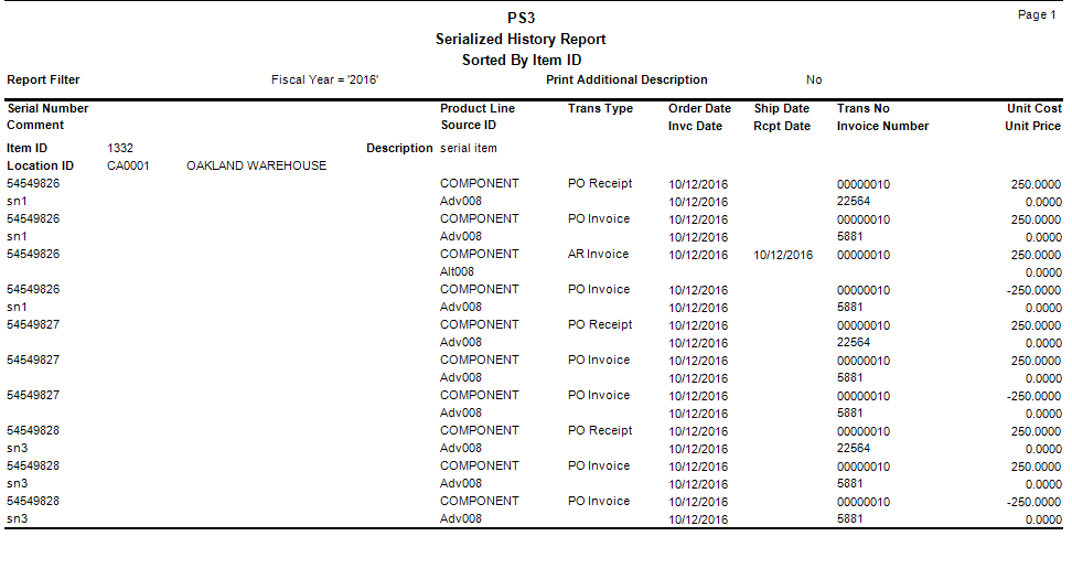 Use the Serialized History Report to view current or historical transaction information for serialized items. You must elect to keep serial history in the Business Rules function to produce this report.