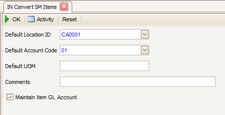 - Select the Maintain Item GL Accounts check box, if applicable, to maintain the items' GL accounts. When you select this option, you will get a continuation of your account code numbering and will name them Auto Gen as the description. A new account code will be made with each combination of account numbers from your SM items.