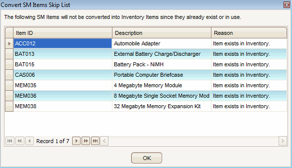 - If some of the items being converted from SM items to Inventory items already exist in inventory you will get a list of those items. Click OK to close the message box.