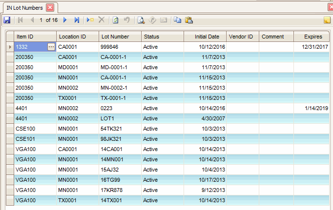 Use the Lot Numbers function to view and add lot numbers for specific items in locations or to edit the Initial Date, Vendor ID, Comment, Expires, and Status values for lots.
