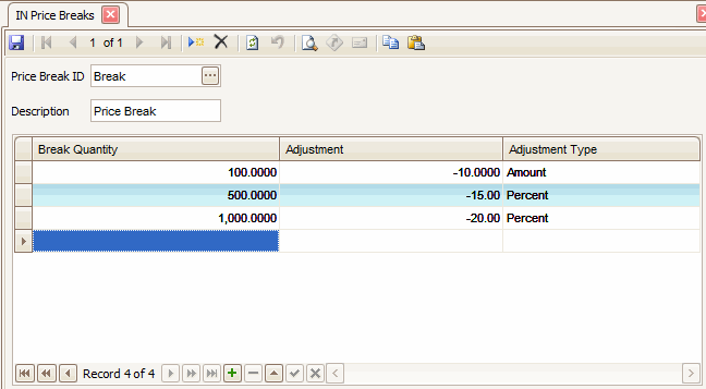 - Enter the amount or percent discount for each item after exceeding the break quantity in the Adjustment field.