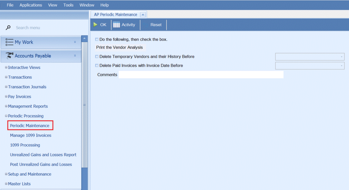 - OPTIONAL: Run AP Periodic Processing to delete temporary vendors (and history). Note: we don’t advise deleting paid invoices as this will impact your ability to accurately run a historical Aged Trial Balance report.