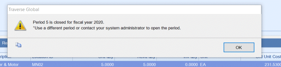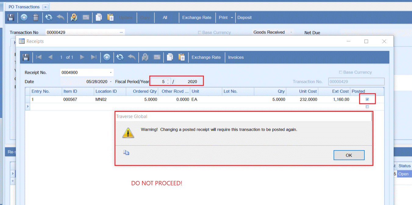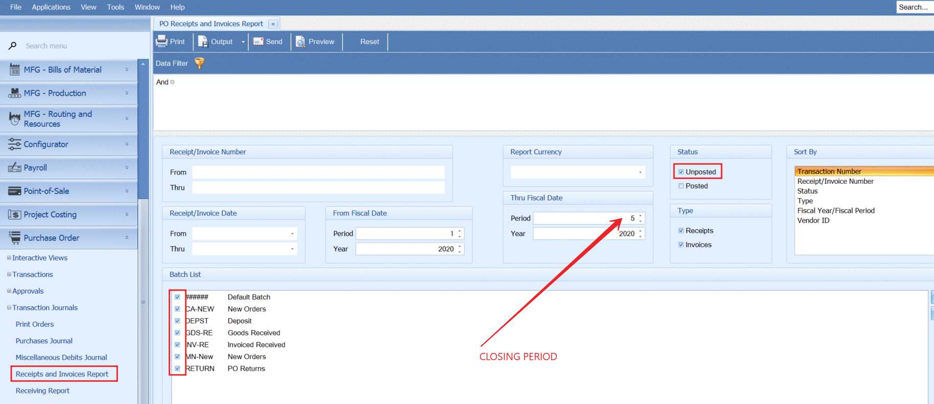 - Post all transactions in Purchase Order. Verify that all posting complete by using the Receipts and Invoices Report.