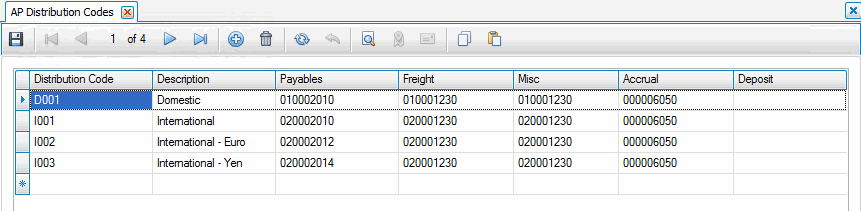 Use the Distribution Codes function to set up and maintain distribution codes, which allocate general ledger accounts for payables, freight, and miscellaneous charges. Distribution codes are tied to specific vendor records.