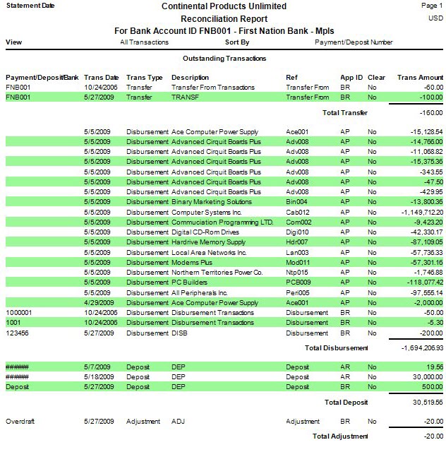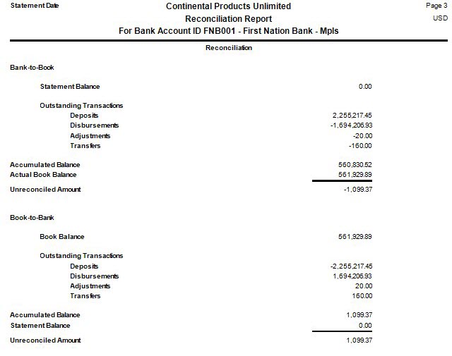 The Reconciliation Report also reflects the extended functionality to capture, retain, and utilize bank account statement information. See Statement Processing for more information.
