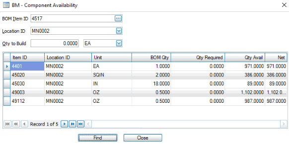 If you want to find the availability for another bill of material, select the BOM Item ID, Location ID, and enter a quantity and unit, for the BOM you want to find the component availability for. Click Find and the component availability is updated with the available components for that BOM.