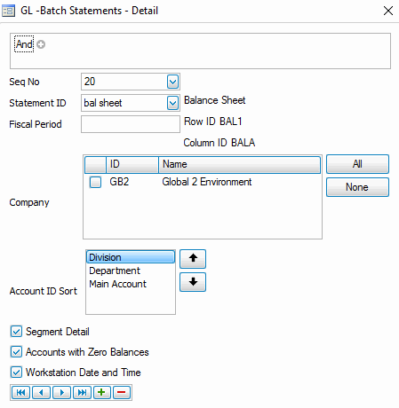 Use the Batch Statements function to set up print parameters for a group of statements in a single record. For example, you can set up similar statements for different companies, add them to a batch, and then select the batch ID to print all of them at one time. You must Build Statements that you want to include before you use the Batch Statements function.