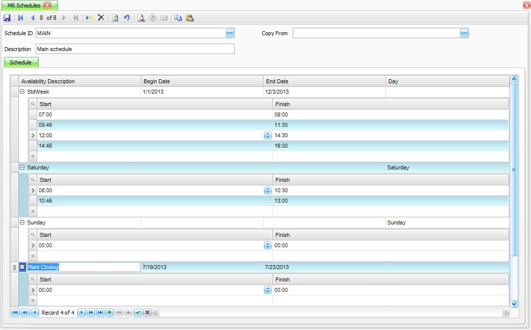 Schedules are used in a couple of different areas of the Traverse production module. It is used in the explosion or “releasing” of production orders and it is used in the Resource Availability report. The Schedule ID is referenced in the creation of labor types, machine groups, and work centers and is a required field. It is also a field in the Production Business Rules. The detailed design and functionality was created to integrate with a third party or future internal scheduling software package, thus the setup may seem like overkill at first glance. In most cases one would want to have one simple schedule and use only that one. Below is a good example of what the simplest schedule might look like with the assumption that there are no Saturday or Sunday hours and the plant hours are the same Monday through Friday.