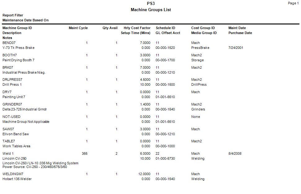 Use this master list to view a list of machine groups, machine group descriptions, maintenance cycles, quantity available, hourly cost factor, and associated GL account, schedule, and cost group.