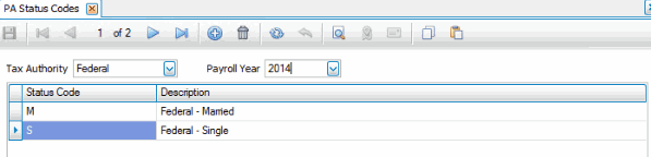 Status codes set up using this function will be available in the employee information setup on the tax tab to select the status for filing and withholding taxes for each employee. Each status code set up here must have a corresponding withholding tax table set up in the formula tables function.