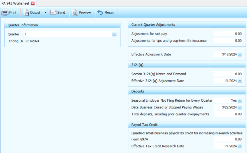 The 941 Worksheet function allows you to print a 941 worksheet showing your company's record of federal tax liability for the quarter you specify. The 941 worksheet generated by Traverse is not meant to be filed with the federal government. Use it only as a reference to complete and file the government-produced form.