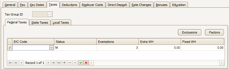 NOTE: The Tax Group ID field will only be active when the Local Taxes tab is selected. Only local taxes are allowed to be assigned to tax groups. See Tax Groups for details on setting up tax groups. If a tax group is selected, the tax group will default into the payroll transactions entered for this employee, and all taxes within the tax group will be calculated. If no tax group is selected, the default withholding (WH) local will be populated into the transaction and the tax group will be left blank.