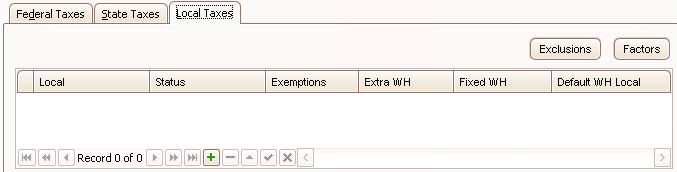 - If applicable, select the local withholding code for the employee in the Local field. To set up local withholding authorities, use the Local Tax Setup function.