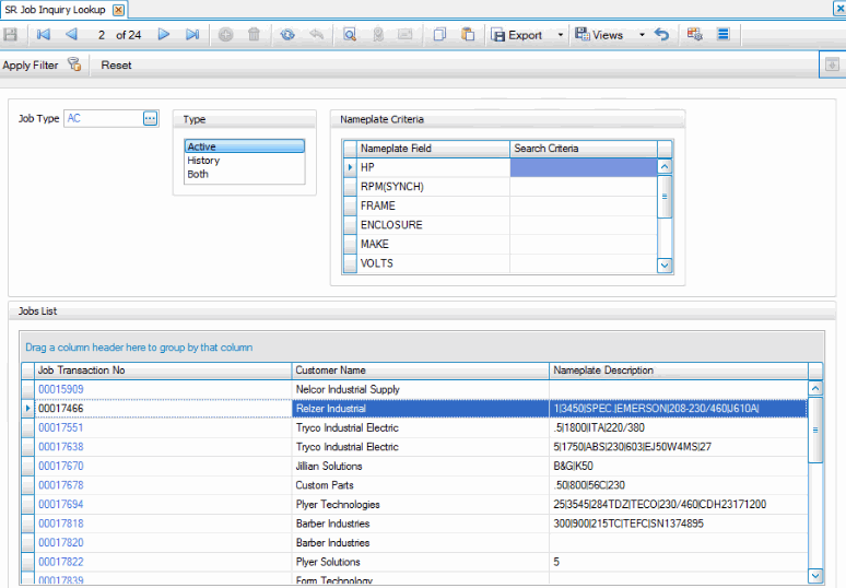 Use the Job Inquiry Lookup function to find jobs to inquire on. This allows you to filter the overall list of jobs by job type, the status of the job (active, historical, or both), and nameplate criteria.