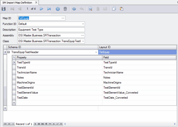 Import Function Assembly Class SR Transactions OSI.Master.Business.SRTransaction OSI.Master.Business.SRTransaction.TransEquipTestImport - Select an import class within the identified Assembly from the Class field.