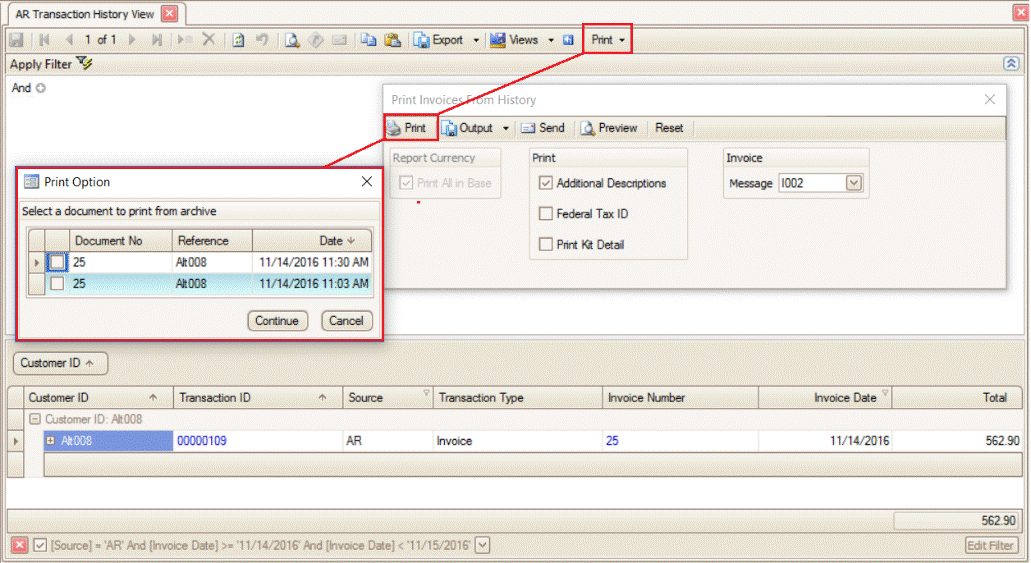 When printing documents from history, you have the option to retrieve archived copies instead of re-rendering from data in history tables. Transactions entered starting in build 16316 will include archived copies, but when they do not exist for transactions entered before this build, documents will be re-rendered using history data.