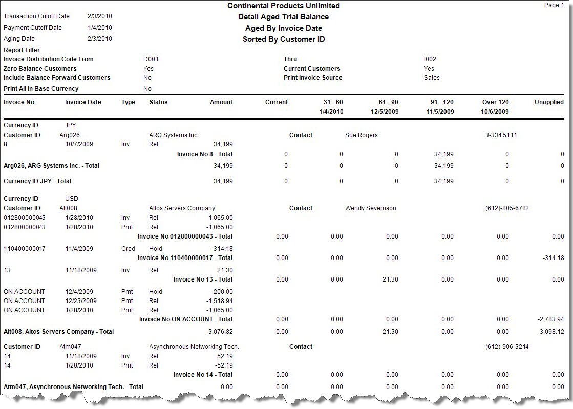 The Aged Trial Balance Report shows invoice balances broken down into five aging periods. You control the sorting, aging, customer type, language, currency and formatting criteria.