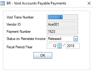 - Click OK to set the reinstated invoice status and return to the Void Checks and Stop Payments menu.