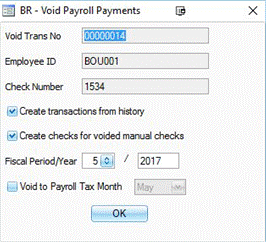 - By default, the check will be voided to the current payroll tax month. Select the Void to Payroll Tax Month check box to change the void payroll tax month to which the void is posted.
