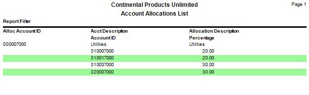 Use the Account Allocations List function to produce a list of allocation records. Use the list to make sure that everything is correct and as a reference when you enter journal transactions. Produce a new list each time you add or change allocation records. To edit the account allocations, use the Account Allocations function.