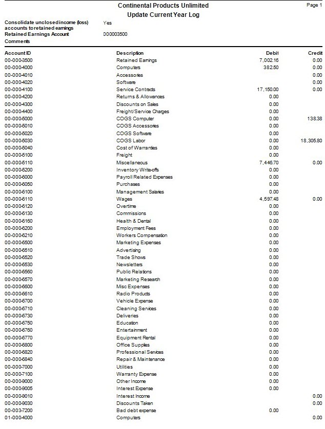 After you clear and close the revenue and expense accounts for a company, use the Update Current Year function to transfer the ending balances from last year to the beginning balances of the current-year. You have the option of consolidating unclosed income/loss into a single retained earnings account, or you can use the Clear To account as defined for each account.
