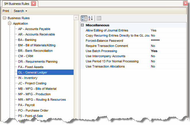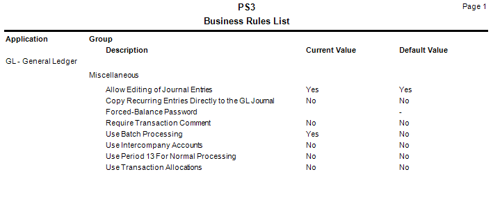 Use the Business Rules function to set up options for the General Ledger and the forced-balance password for the Transactions function.