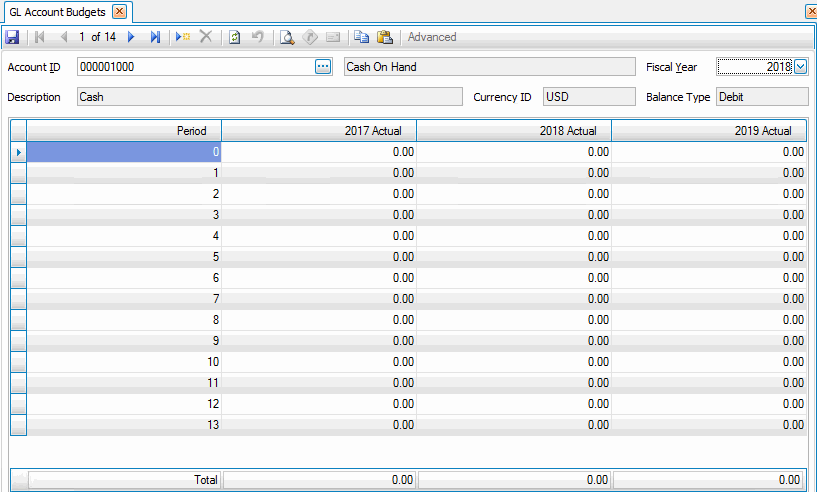 Note: You cannot use this option in Period 0 or 1, the last-year columns, or the current-year Actual column. - Click the Save button, on the toolbar, to save any changes made to the account budgets.