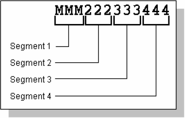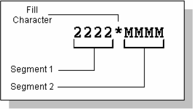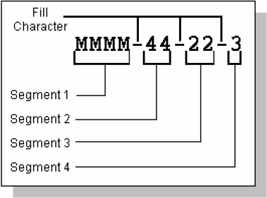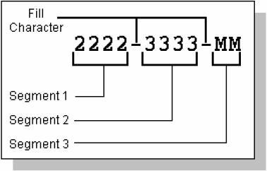 The format of an account number is defined by an Account Mask. A mask specifies the number and type of characters in each segment and the fill character that might separate segments. Use the Account Mask function to define an account mask, the number of segments in an account number, and fill characters.