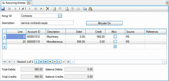 - The Total Debits and Total Credits for the recurring entry are displayed. The total debits must equal the total credits when you exit from the screen.