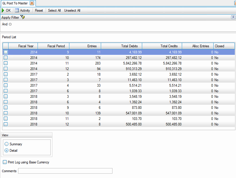 - Select the period(s) from which to post transactions using the Select All button, Unselect All button, or the check box adjacent to the period(s).
