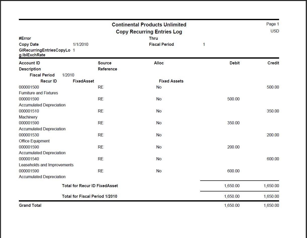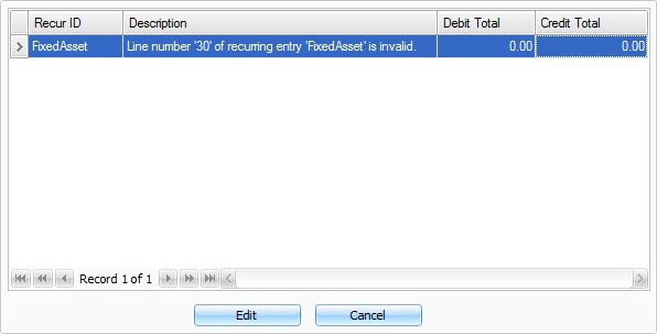 The Copy Recurring Entries Error Listing screen appears if errors occur before recurring entries are copied. The error listing shows the entries that produced errors. To fix the entries in the error listing, follow these steps: