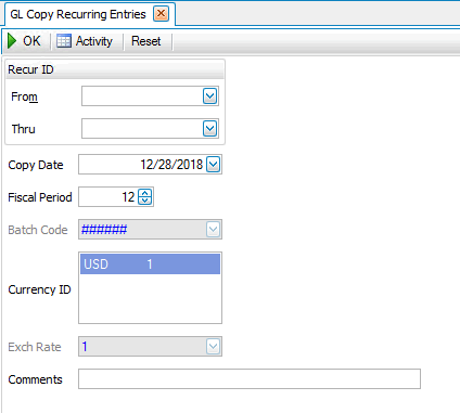 - If you use multi-currency, the currencies for which recurring entries exist (and the number of recurring entries involving that currency) appear in the Currency ID box. Select the currency to copy those recurring entries. You can select only one currency at a time. This box does not appear if you do not use multi-currency.